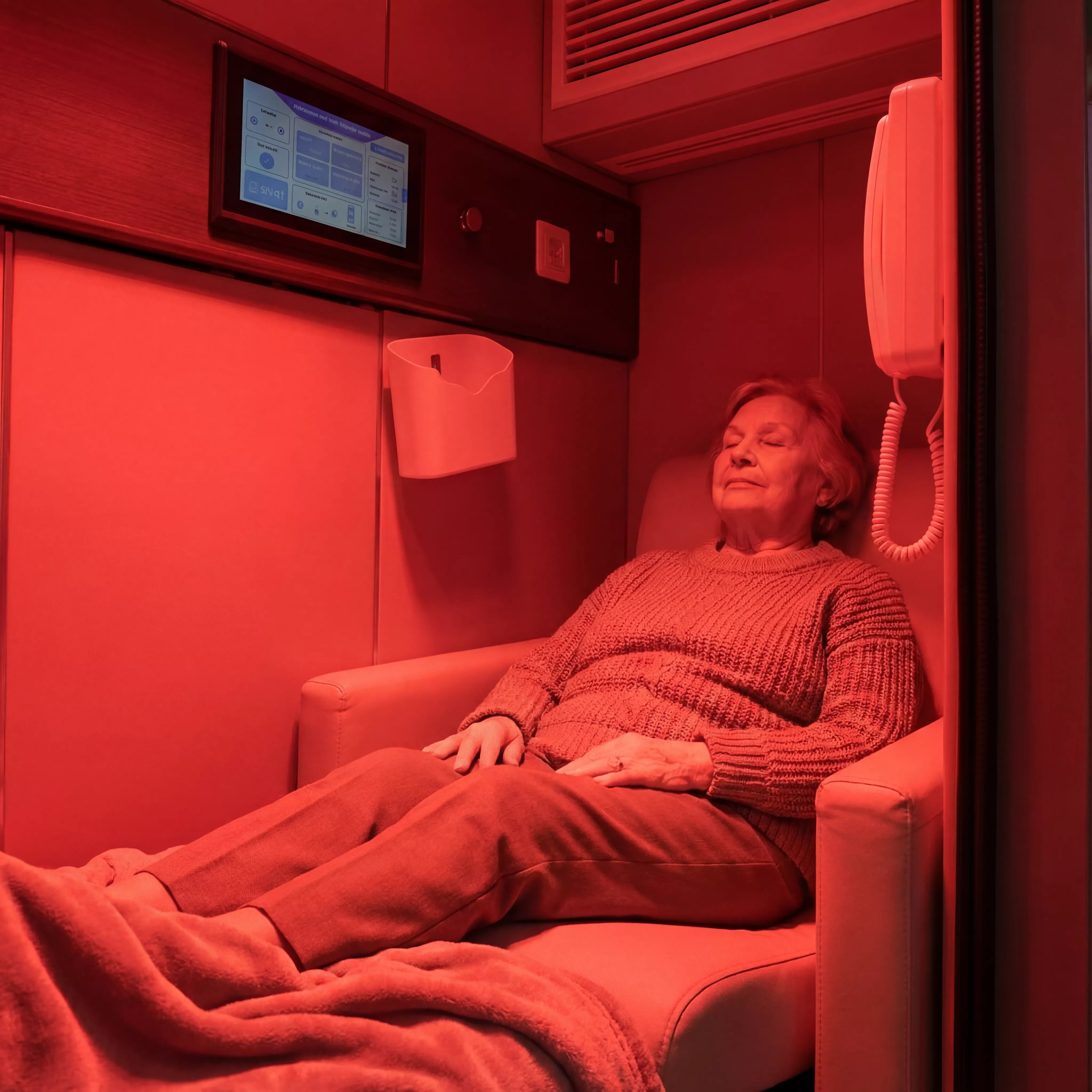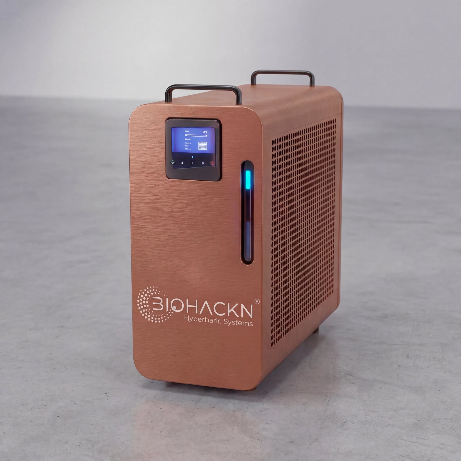 Precision-engineered hard-shell oxygen chamber designed for repeatable, comfortable micro-hyperbaric sessions. Upright format, water-cooled climate control, and a safety-first control architecture built for home and clinical environments.